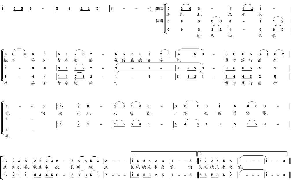 书海无涯勤求索,明德砺志学为先。啊,天行健,气浩然,汉江潮涌涛声远。扎根秦巴,胸怀天下,志存高远。时代重任挑在肩,时代重任挑在肩。